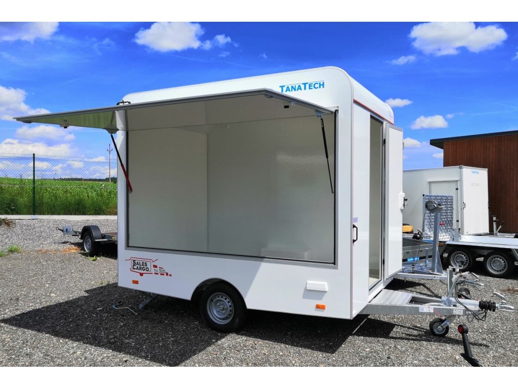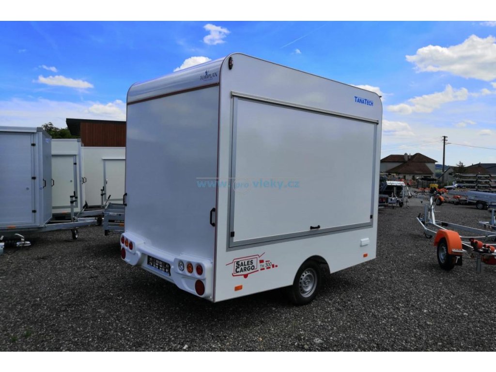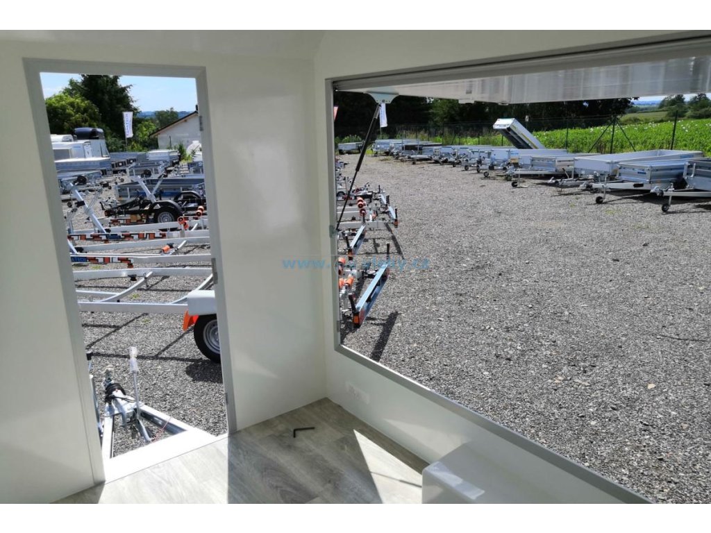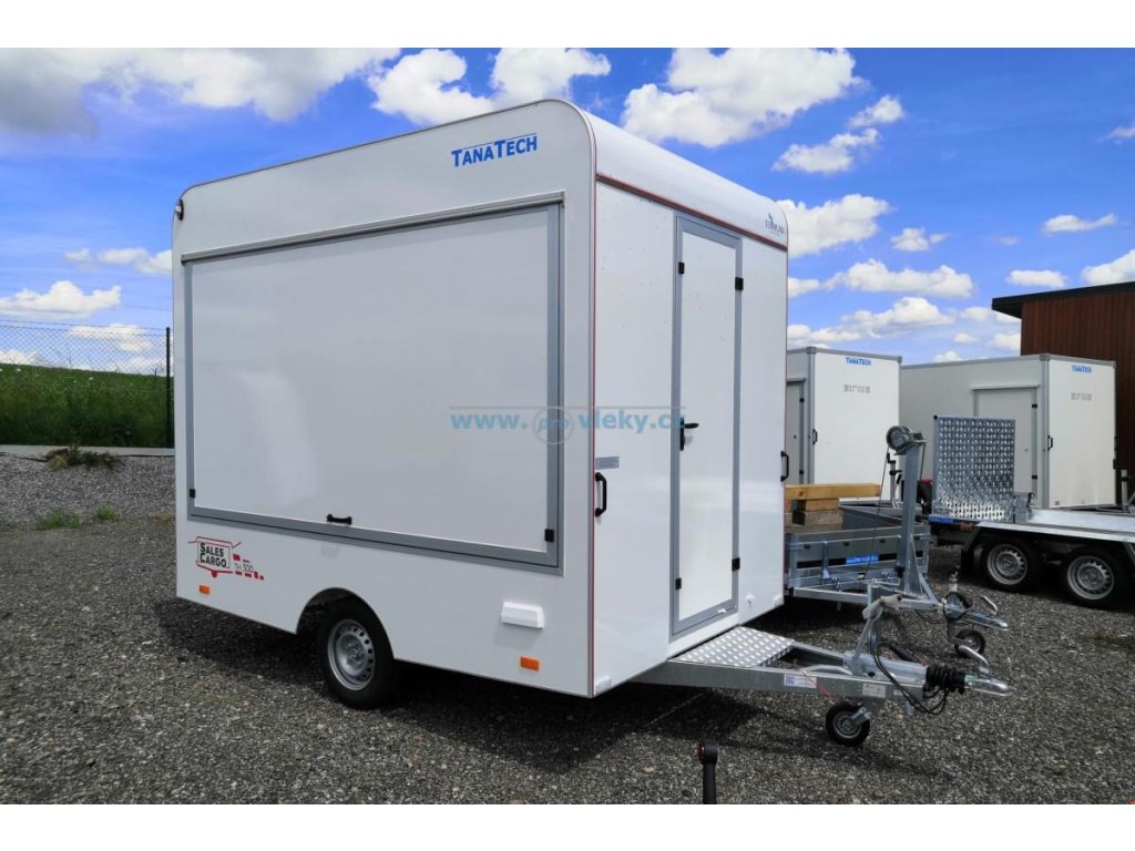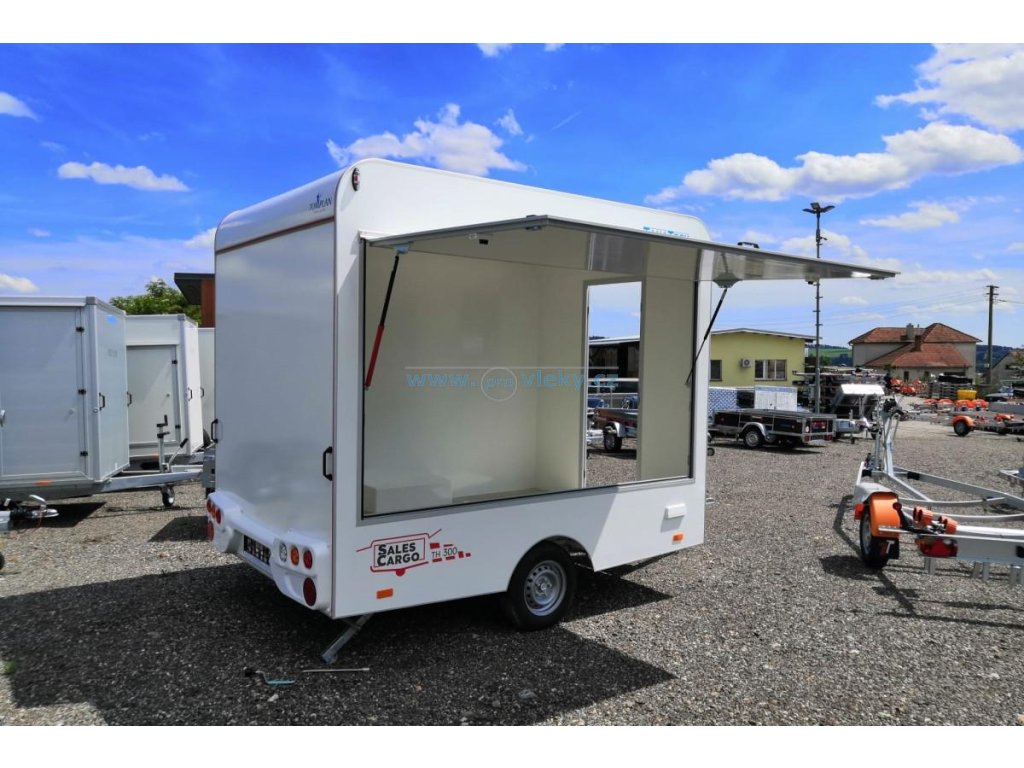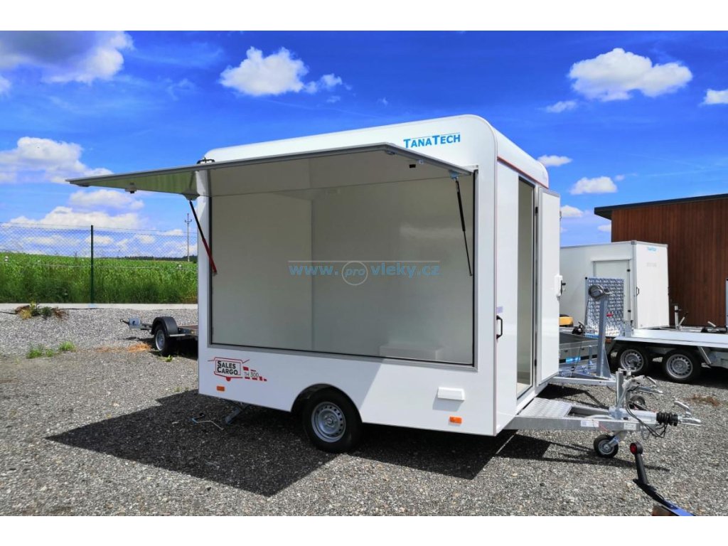 Príves vybavený ako predajný stánok - vstupné dvere, bočný výklop, oporné nohy.