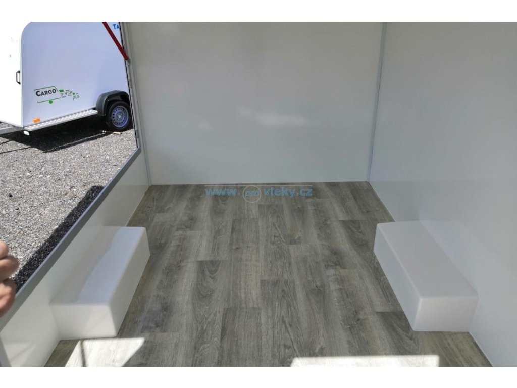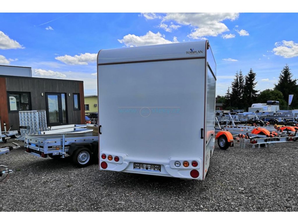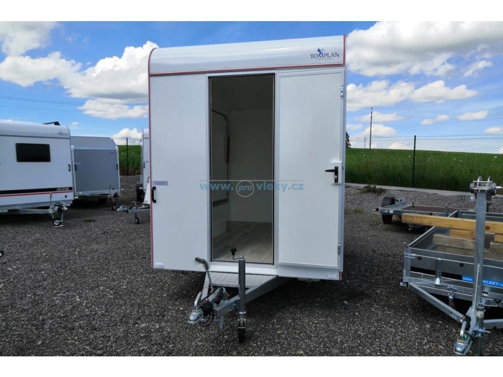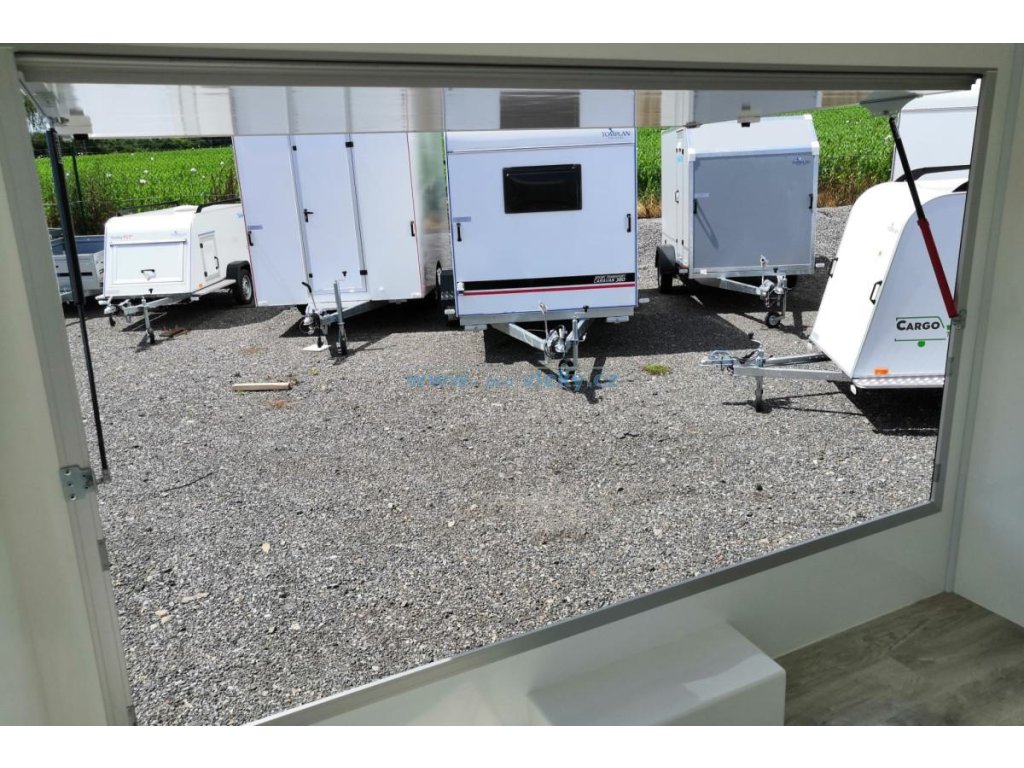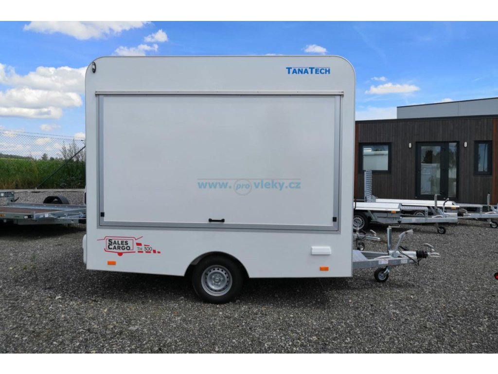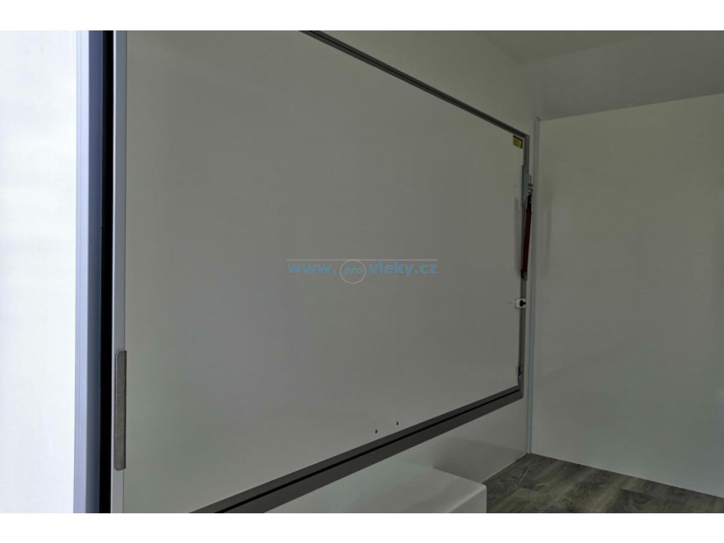 Príves vybavený ako predajný stánok - vstupné dvere, bočný výklop, oporné nohy.