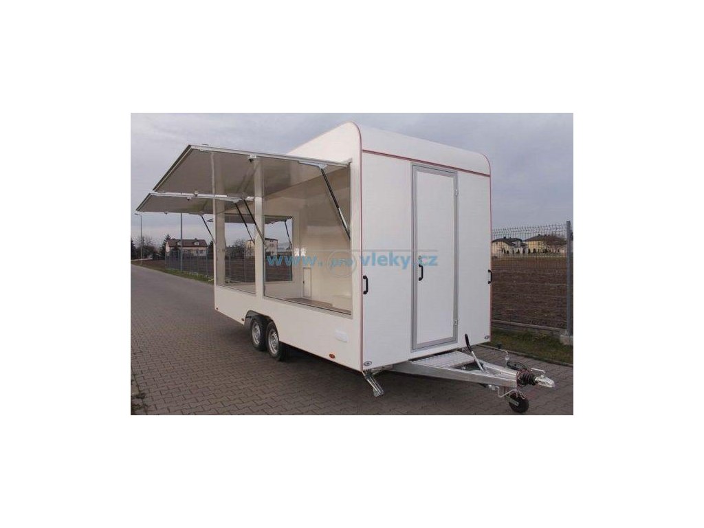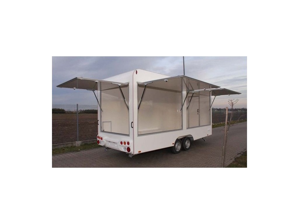 Príves vybavený ako predajný stánok - vstupné dvere, bočný výklop na boku av zadnej časti, oporné nohy.