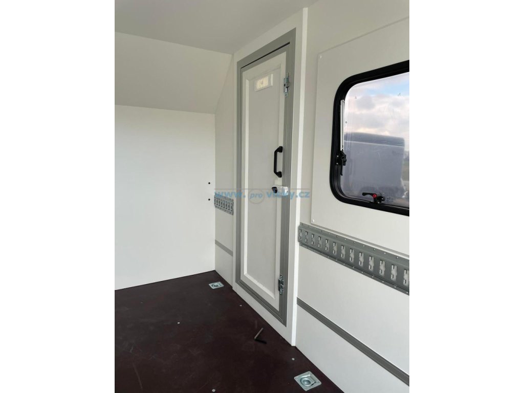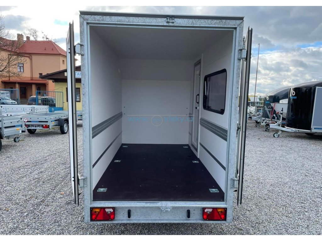 Skvele vybavený preglejkový brzdený prívesný vozík s predným aerodynamickým skosením, zadnou nájazdovou rampou, bočnými dverami a oknom.